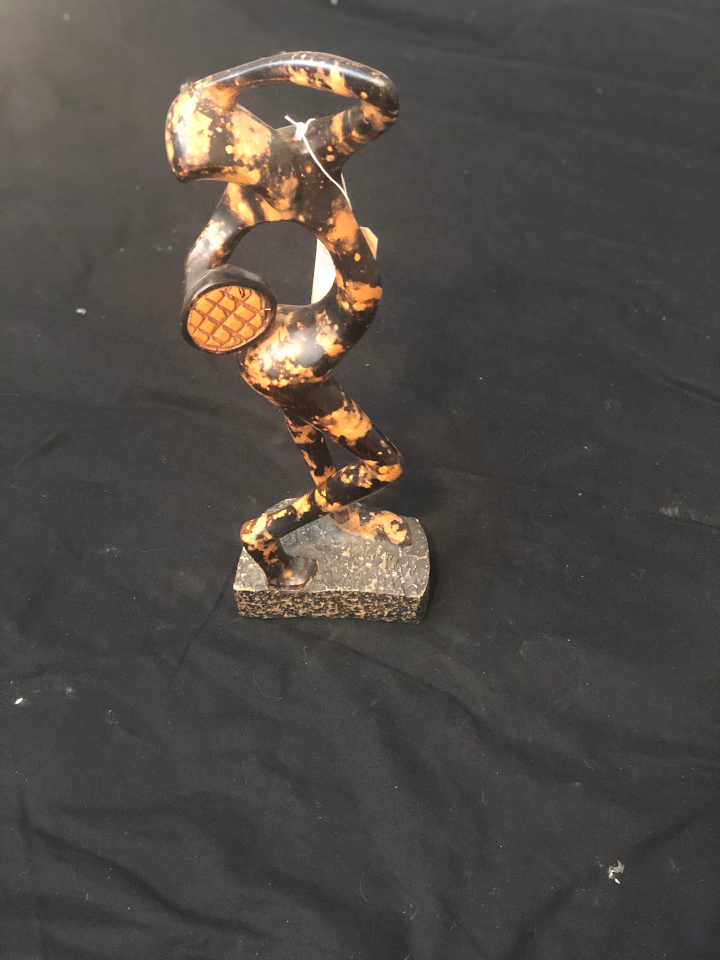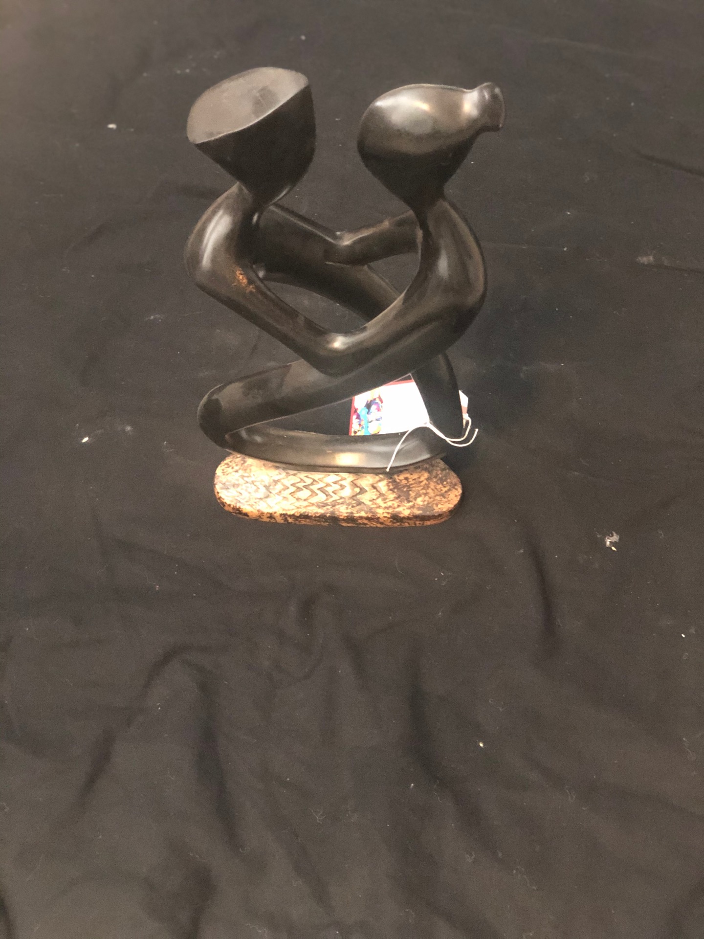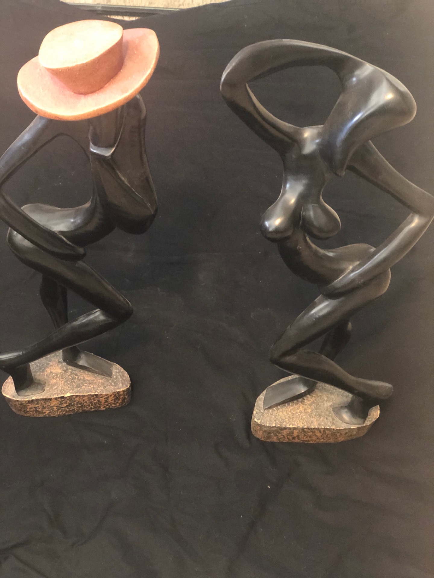 31"L X 9"W TALL ABSTRACT DANCERS, CARVED BY ARTIST JERRY KOETY IN GHANA! SPECKLED TAN, AND BLACK BASE, WITH BLACK BODY'S AND MALE HAS RED HAT! THIS COUPLE IS SUCH A HIT FOR ANY DECOR OF CHOICE! COMES AS A SET ONLY!