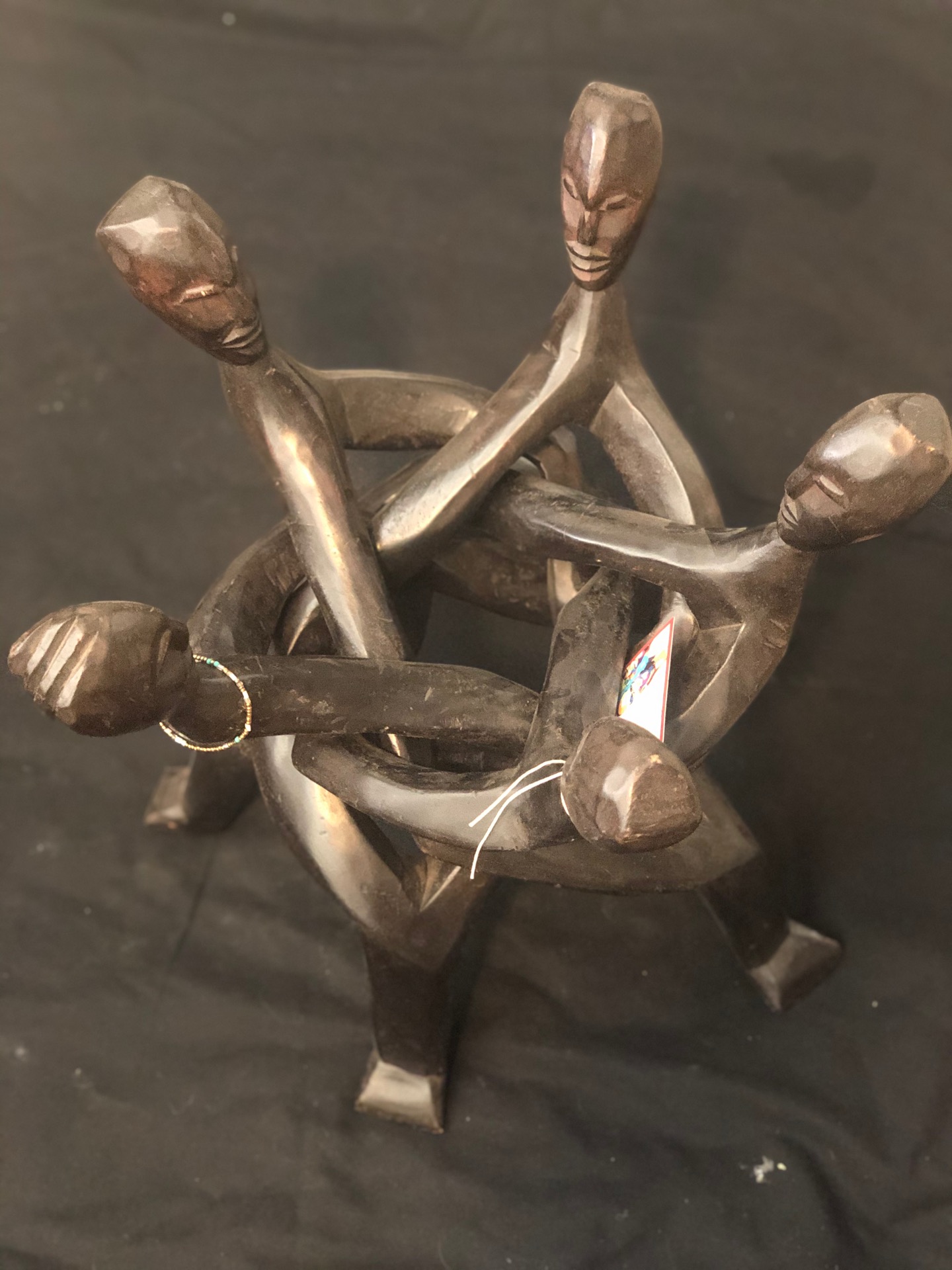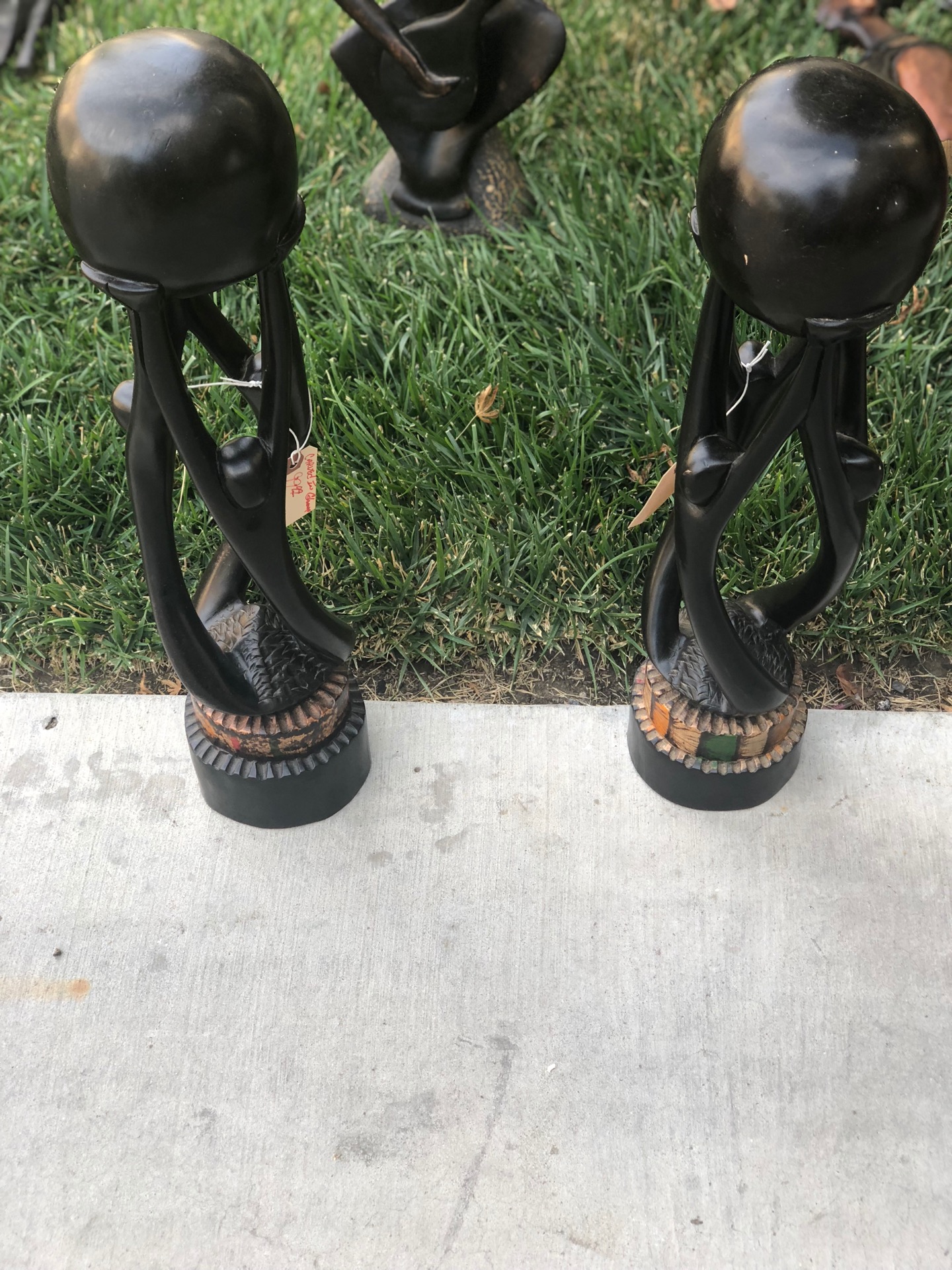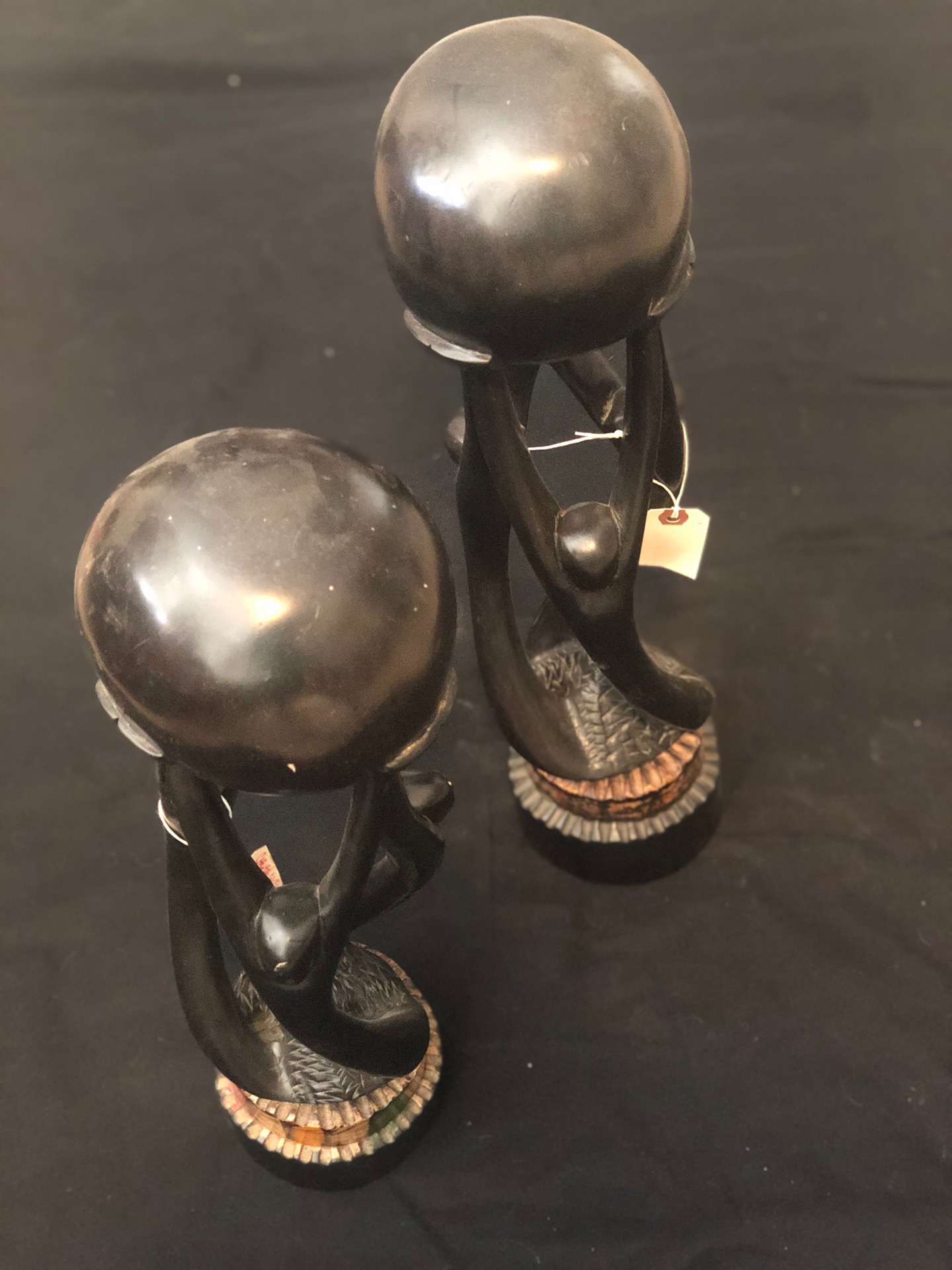 31"L X 9"W TALL ABSTRACT DANCERS, CARVED BY ARTIST JERRY KOETY IN GHANA! SPECKLED TAN, AND BLACK BASE, WITH BLACK BODY'S AND MALE HAS RED HAT! THIS COUPLE IS SUCH A HIT FOR ANY DECOR OF CHOICE! COMES AS A SET ONLY!