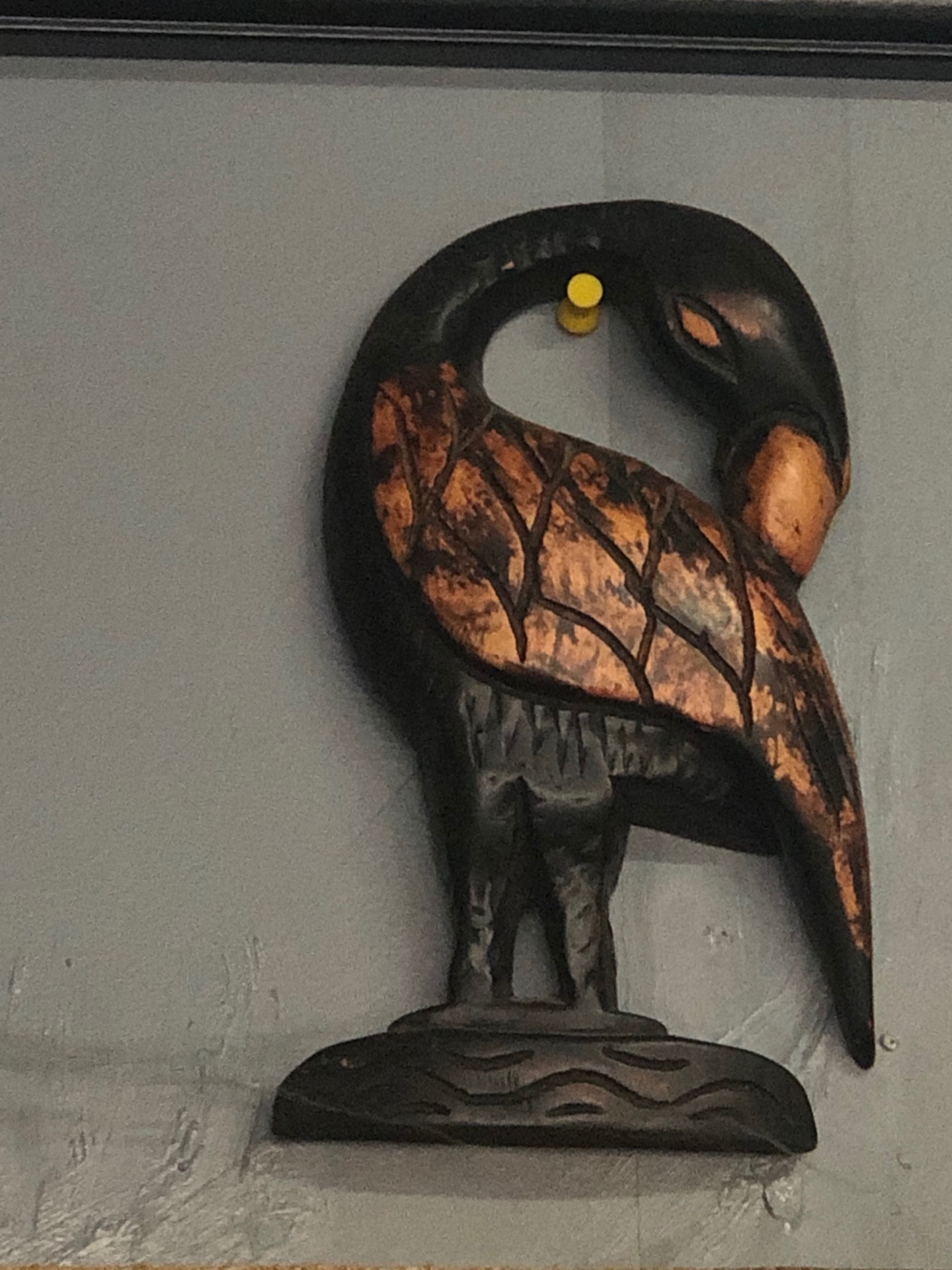 19 1/2L X 11 1/2W, CARVED AND FINISHED IN A SHINNY COLORFUL, RED, GREEN, GOLLD, TAN, AND BLACK!