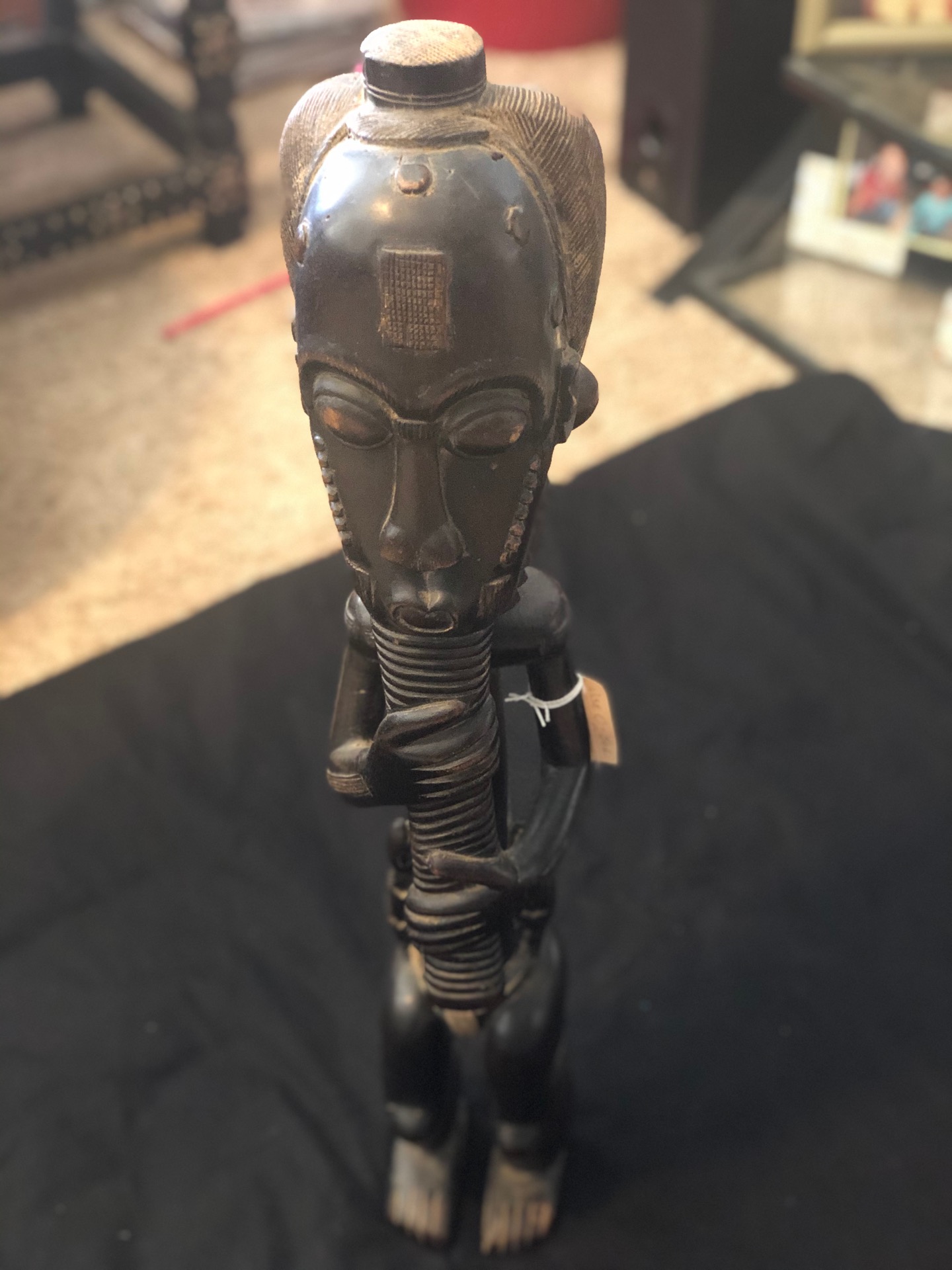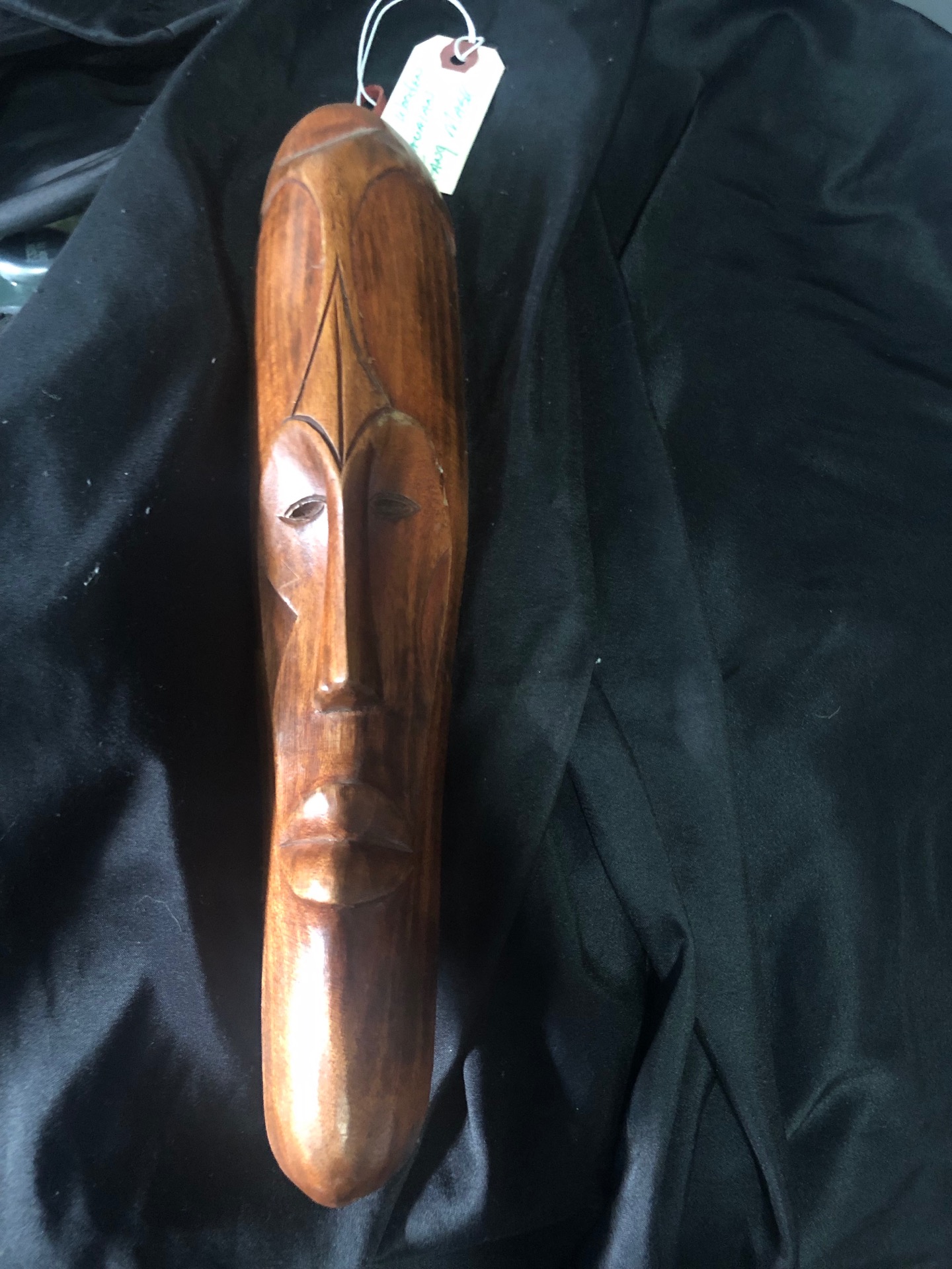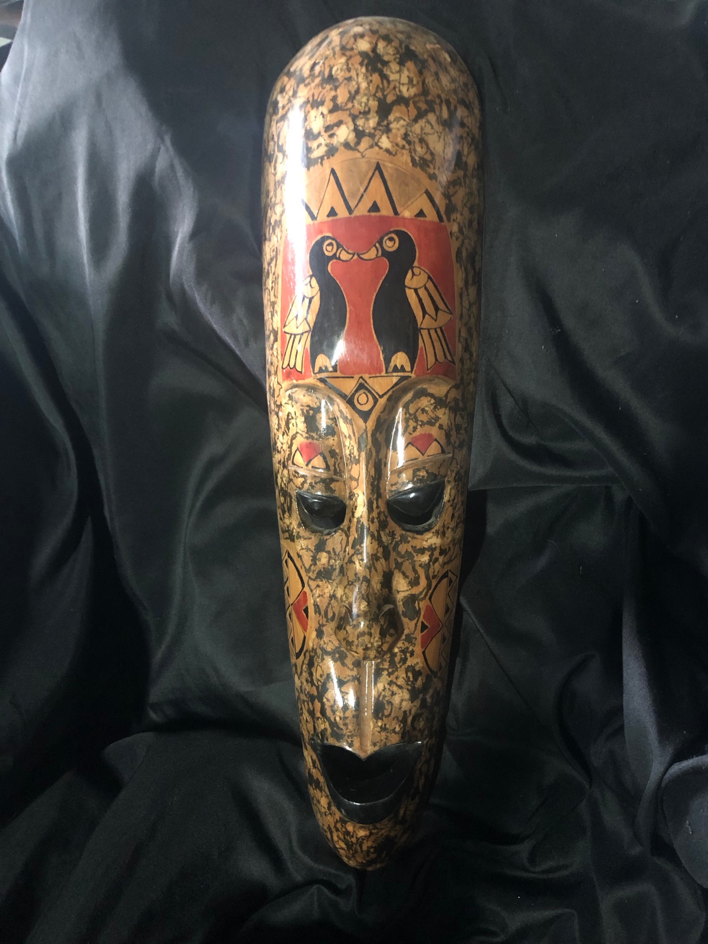 APPROX. 29"L X 11"W, NICE TALL PIECE CARVED IN GHANA BY ARTIST JERRY KOETY! COLORS ARE BROWN, BLACK, & TAN!