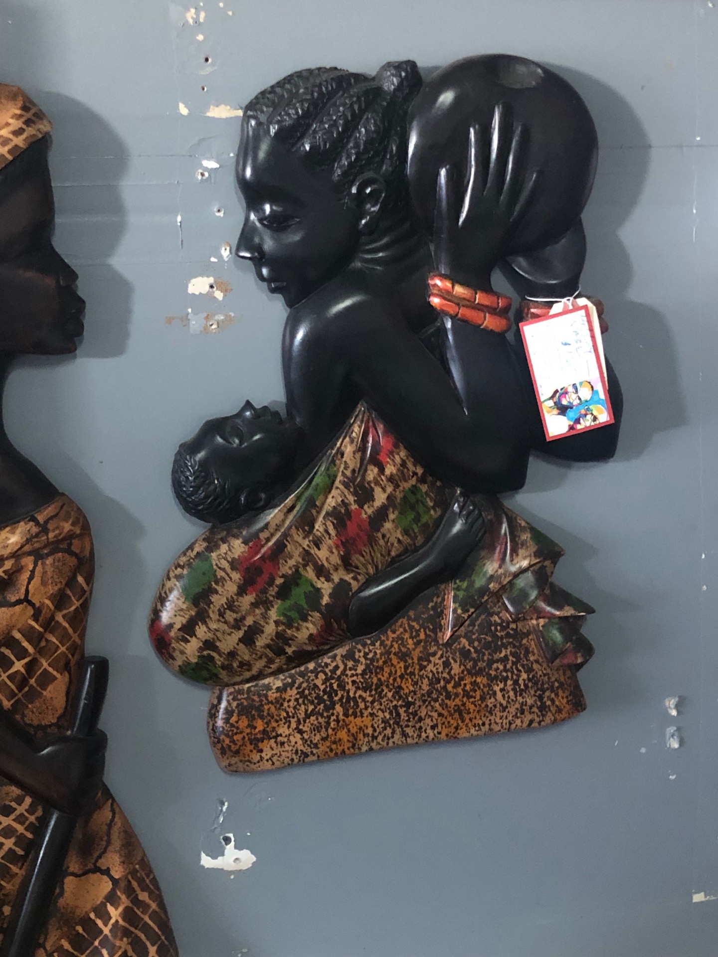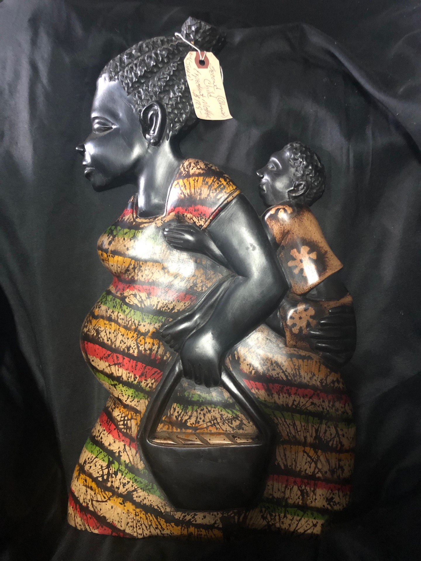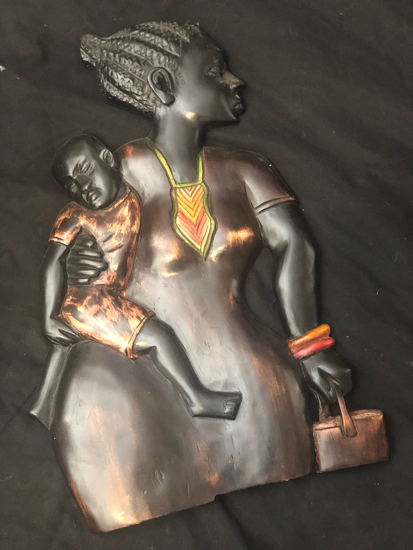 21"L X 13"W MOTHER WORKING WITH CHILD, WEARING SEEDED NECKLACE, ALL MADE IN GHANA! HAND CARVED BY JERRY KOETY! COLORFUL RED, GREEN, CREAM, ORANGE, BLACK, AND BROWN!