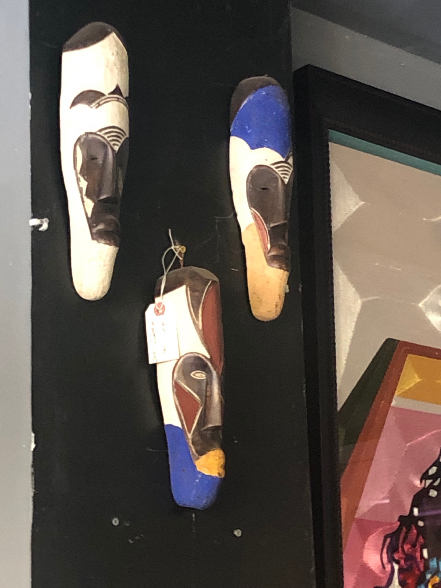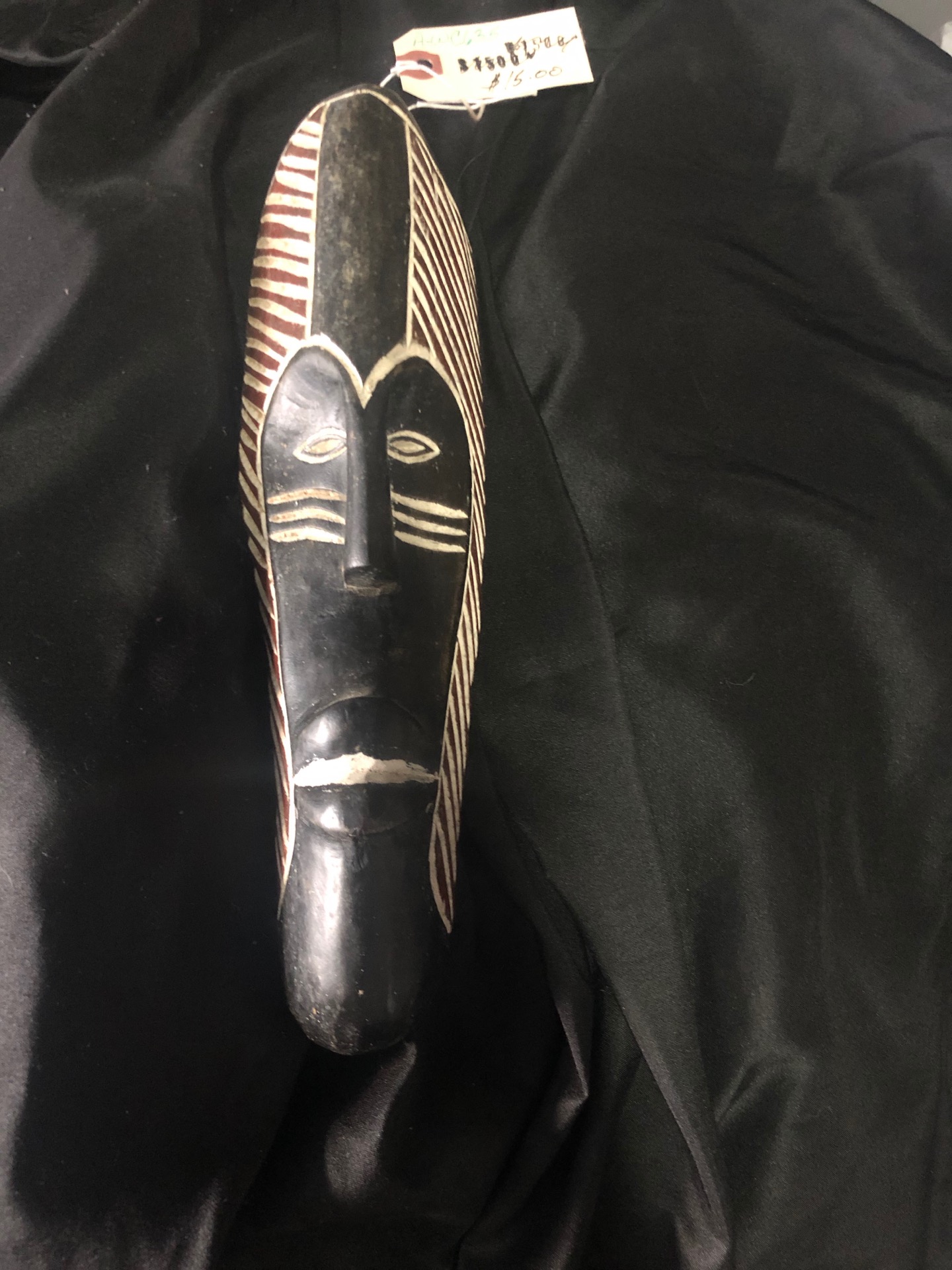 13" X 3" WHITE, TAN, RUST, BROWN, AND BLACK CARVED TRIBAL MASK! SMALL HAND CARVED IN GHANA! Location: G