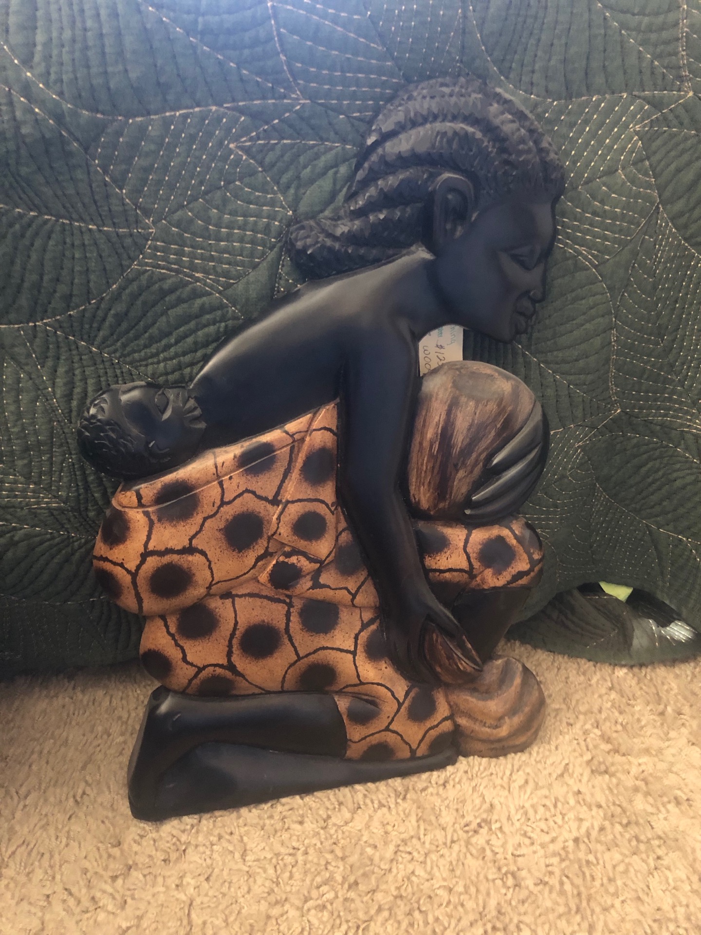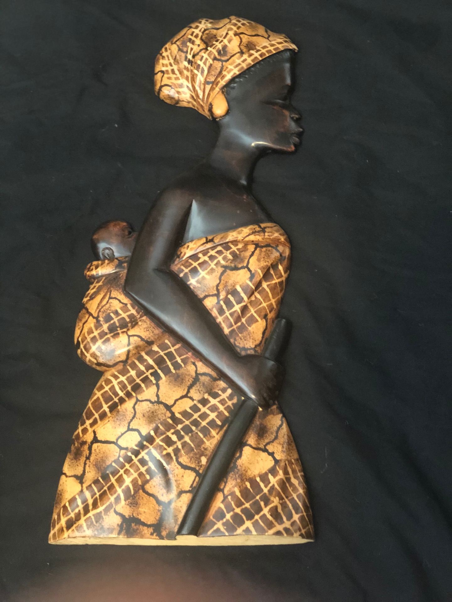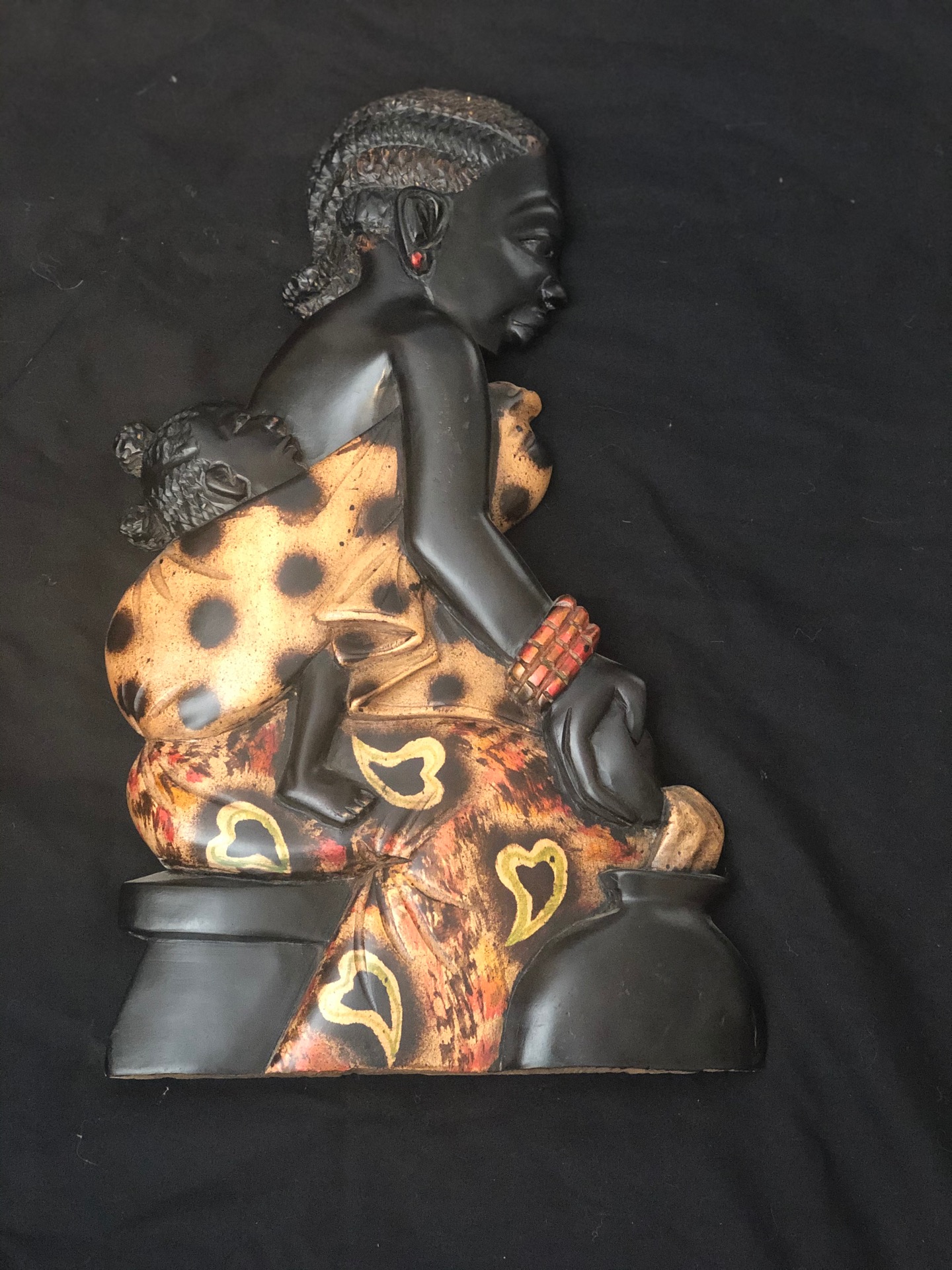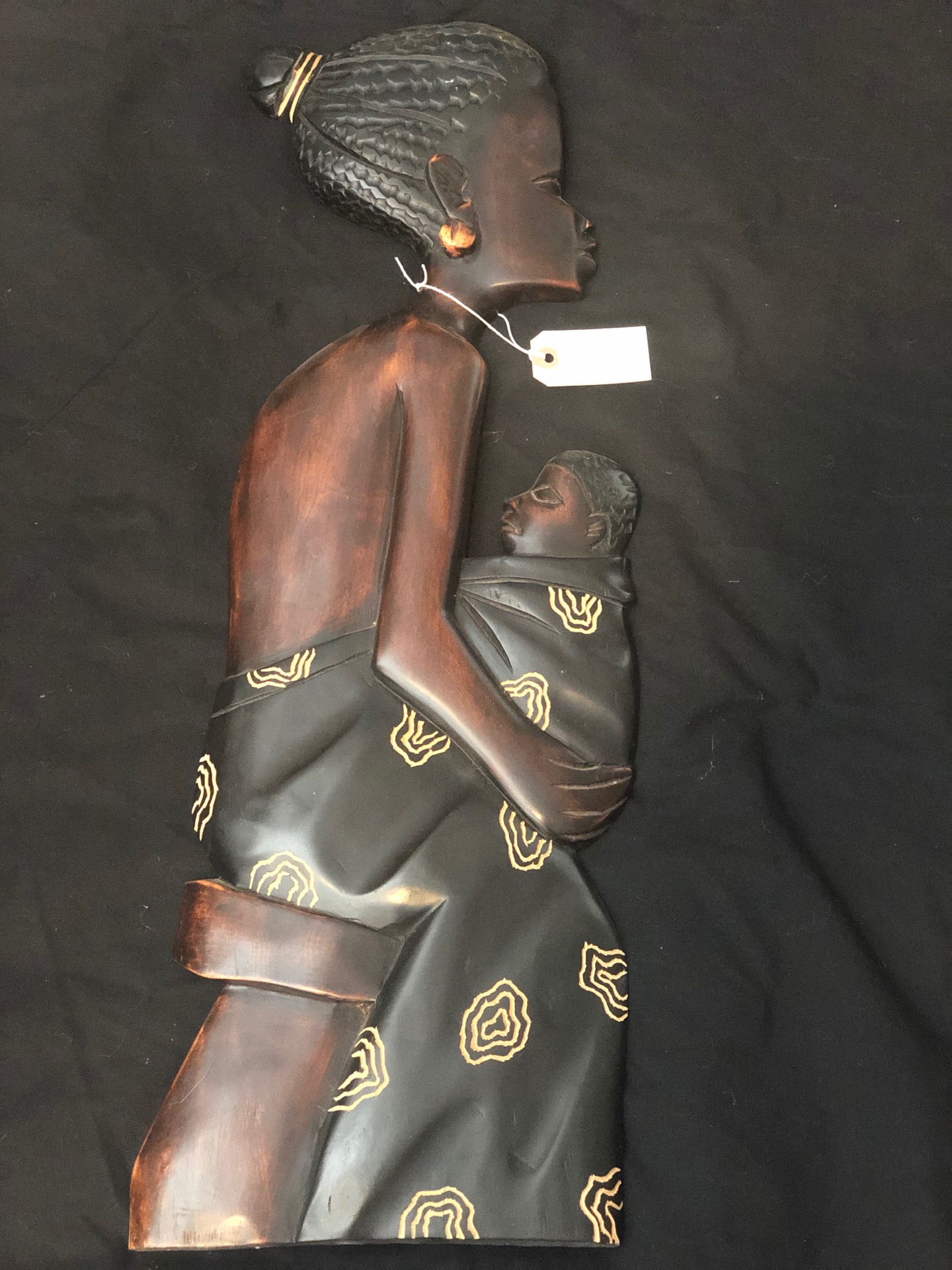 20 1/2 X 13" MOTHER FETCHING WATER! BEAUTIFUL PIECE WITH A NICE SHINE FINISH! COLORS ARE BLACK, AND TAN CARVING!