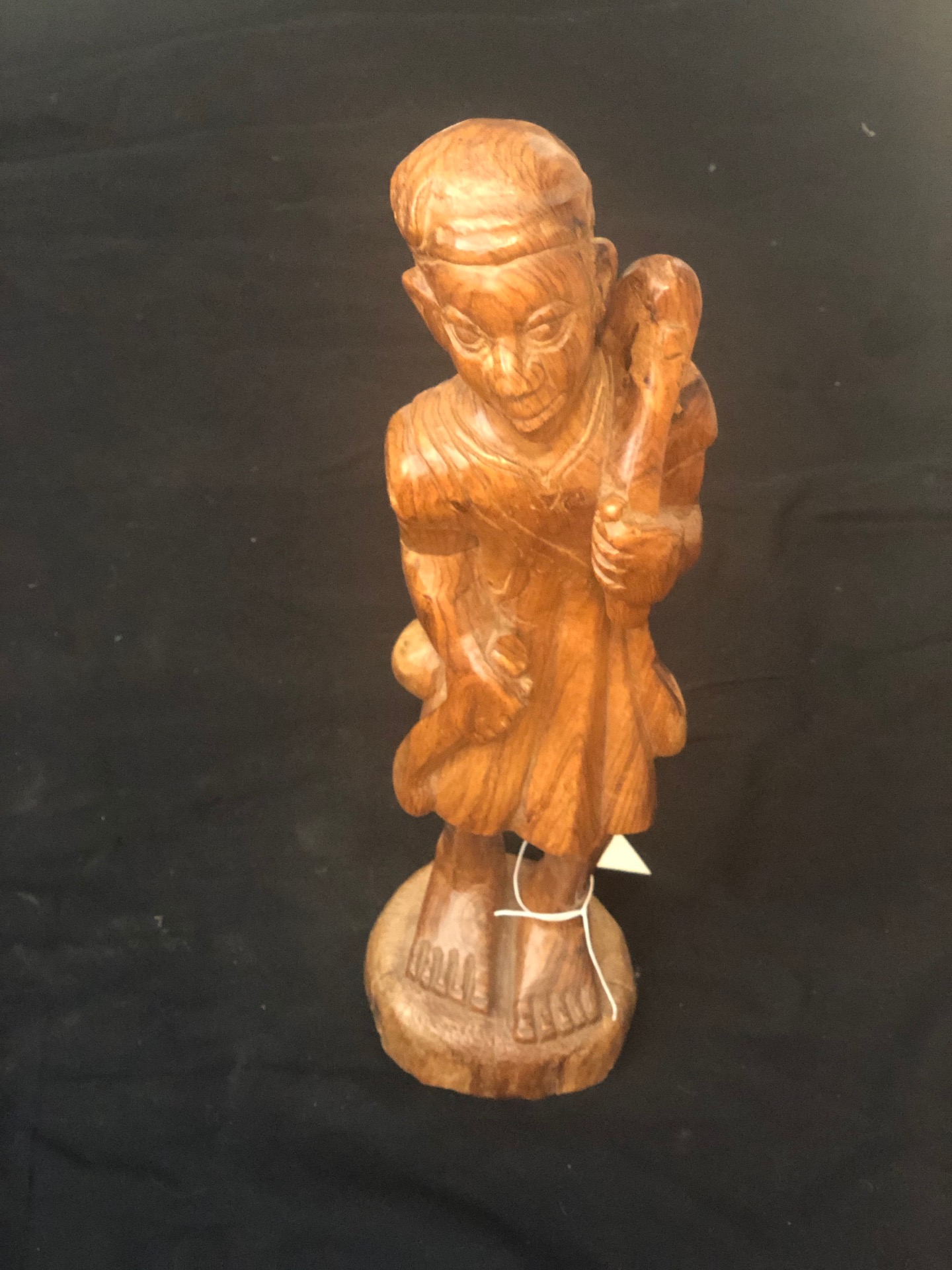 19"L X 6"W HARD WOOD HUNTER CARVED BY ARTIST JERRY KOETY (GHANA)! THE HUNTER IS NATURAL EBONY WOOD GRAIN & HEAVY IN WEIGHT APPROX. 4LBS!